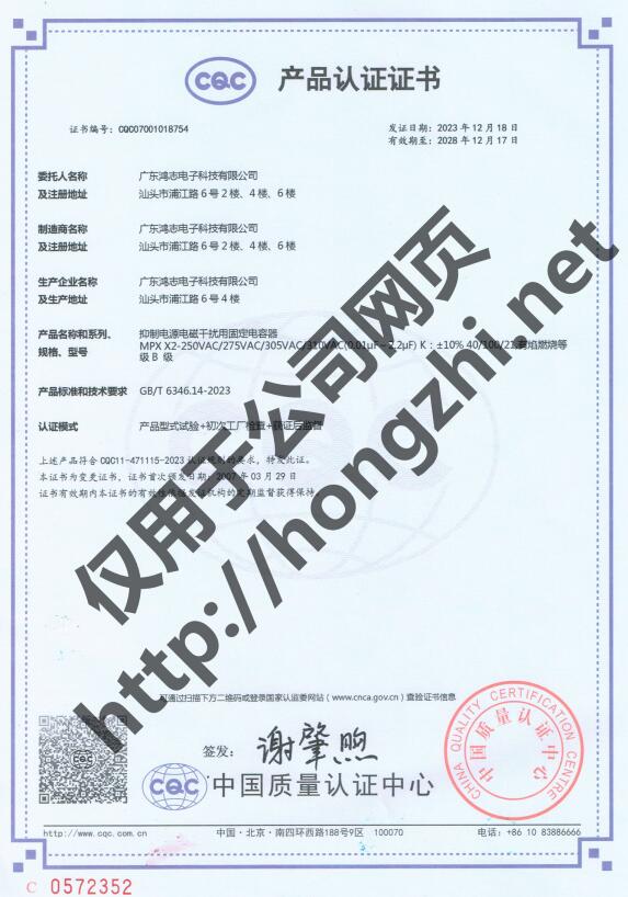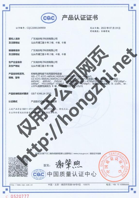 陶瓷電容Y2-CQC證書